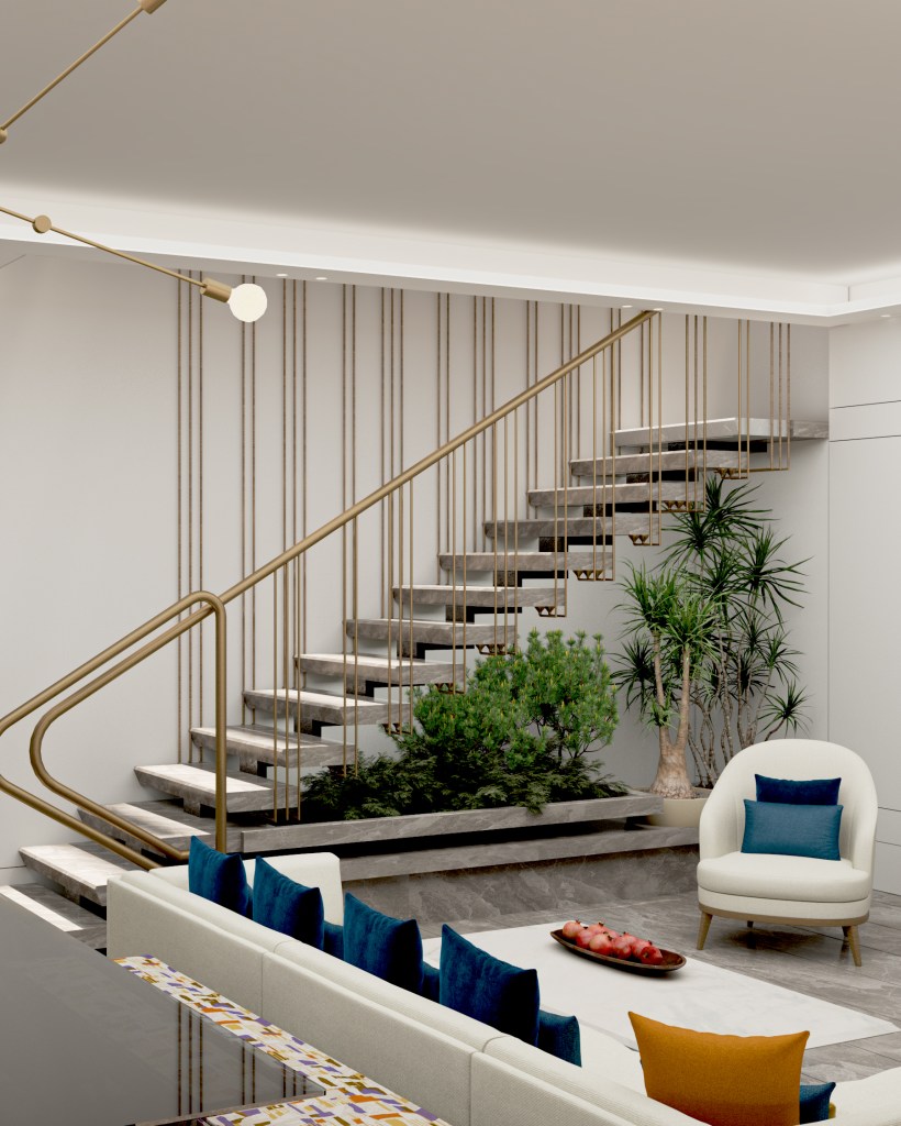 Our design approach involved cutting an opening in the concrete slab above the stairs, removing the old tiles in the kitchen and bathrooms, and creating a wider connection between the kitchen and reception area. The old staircase was replaced with an open-riser staircase to create a more spacious feel and an interior garden was planted to become the focal point of the home.